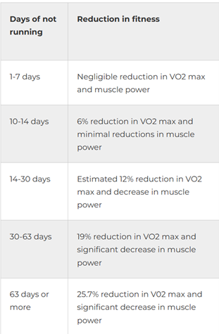 As frustrating as that may be, your hard-earned fitness takes longer to leave you than one might suspect. As a reference, I included a chart below that gives high level results from a couple of studies on this topic. Looking at the chart, you really don’t see a significant decline start to occur until after about the 14-day mark. While this chart is obviously not a perfect depiction of what happens when you take some time away, I find it reassuring to recognize that even an entire week out of training will make a negligible difference in the long run.